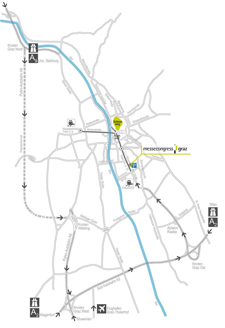 Der Messecongress befindet sich auf dem Messegelände neben der Stadthalle, zentral im Stadtgebiet von Graz. Von der Autobahnabfahrt Graz-Ost sind es 1,5 km zum Gelände und der Flughafen Graz liegt 10 km entfernt.